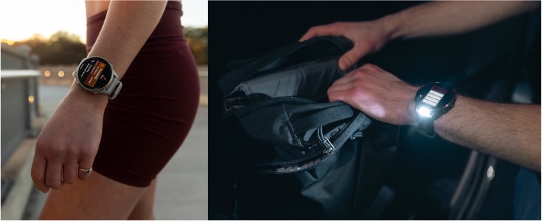 ● LED手電筒:採用藍寶石鏡面與輕量鈦金屬錶圈強化耐用性,內建 LED 手電筒支援四段亮度等級與紅光,並提供多種頻閃模式及SOS求救燈號,安全升級。