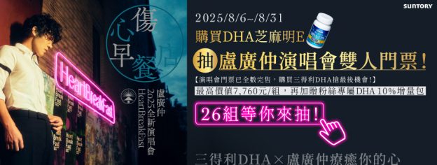透過這次機會不只能讓你輕鬆守護健康,還有機會到開賣即秒殺的極限量《傷心早餐店》演唱會,讓盧廣仲修復你受傷的心!現在就把握機會,於2025/8/6-2025/8/31,透過『三得利健康網路商店Facebook粉絲專頁』的指定活動貼文連結進入,購買「DHA芝麻明E 30天份」商品兩瓶(含)以上,不但能照顧健康,還能抽《傷心早餐店》雙人門票一組,快把健康與好運一起帶回家!