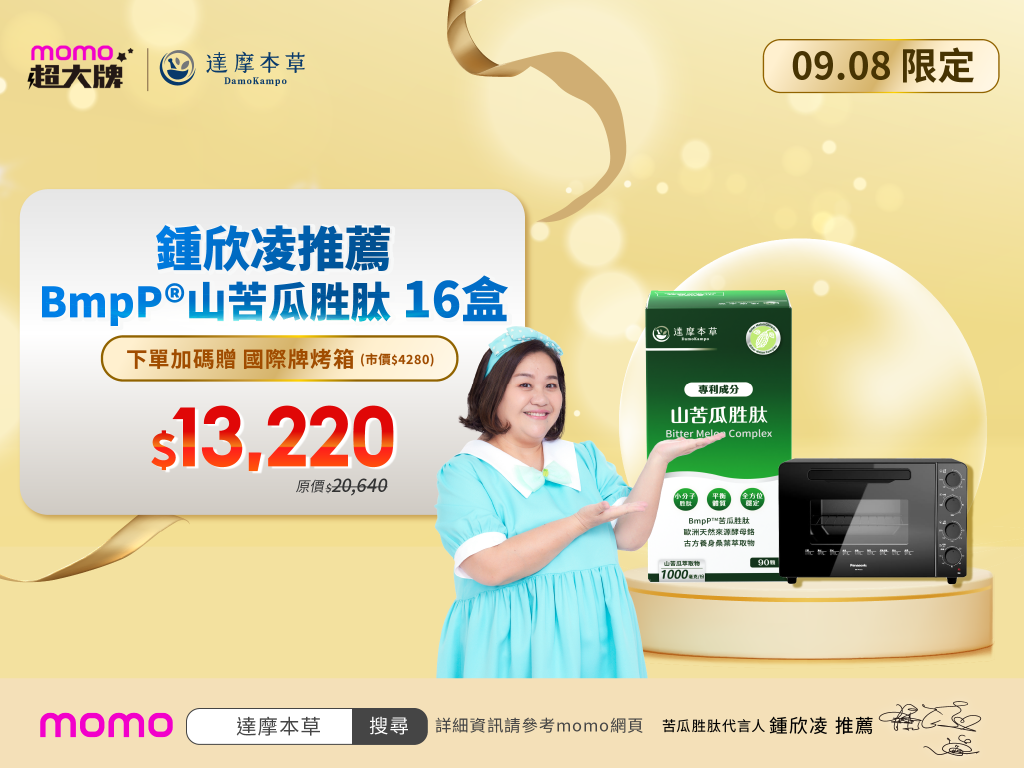 • 達摩本草 BmpP® 專利苦瓜胜肽 16 盒:原價 32,000 元,一日優惠價 下殺41折$826元/瓶,加碼送「國際牌 32L 全平面機械式電烤箱」市價$4,280。