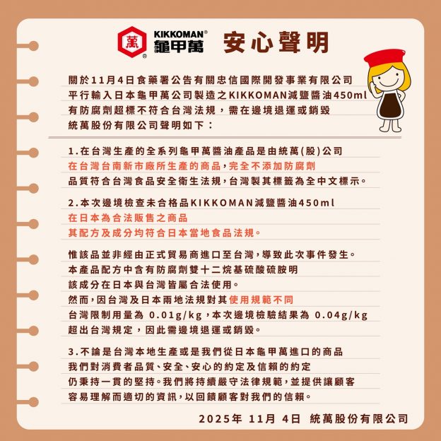關於11月4日食藥署公告有關忠信國際開發事業有限公司平行輸入日本龜甲萬公司製造之KIKKOMAN減鹽醬油450ml,有防腐劑超標不符合台灣法規,需在邊境退運或銷毀,統萬股份有限公司聲明如下: