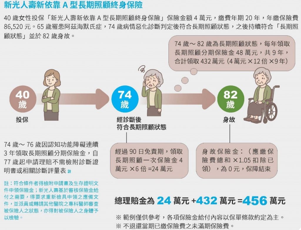 • 「新依靠A型長期照顧終身保險」 適合預算較充裕、重視資產傳承的族群。且具有壽險保障功能,若保戶身故,將給付身故保險金或喪葬費用保險金(壽險當年度保險金額,係指應繳保險費總和的05倍扣除已申領之各項保險金總和),讓保費有去有回,兼顧長照防護與資產保全。