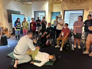 照顧長輩不一定從醫療開始,而是從陪伴開始,李秉盛院長(右二)與行銷長(右一)親身參與,一同關心熟齡族群。圖/ 業者提供