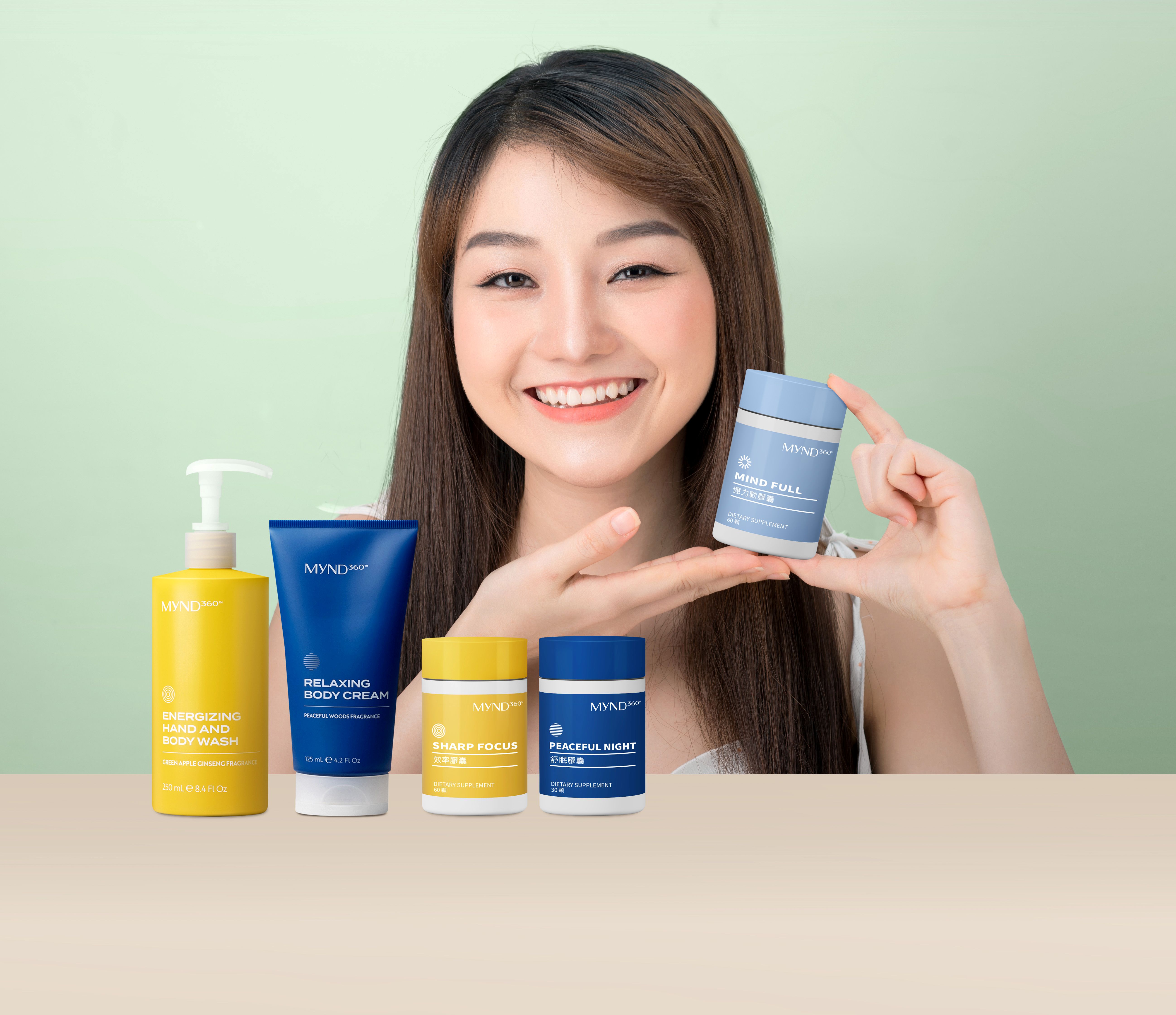 • MyND360 憶力軟膠囊:含有三大關鍵成分──紅藻萃取物、葡萄萃取物、維生素E ,幫助調節生理狀態,維持神采奕奕、記事清晰、敏銳靈光,精準處理大小事,做事游刃有餘。