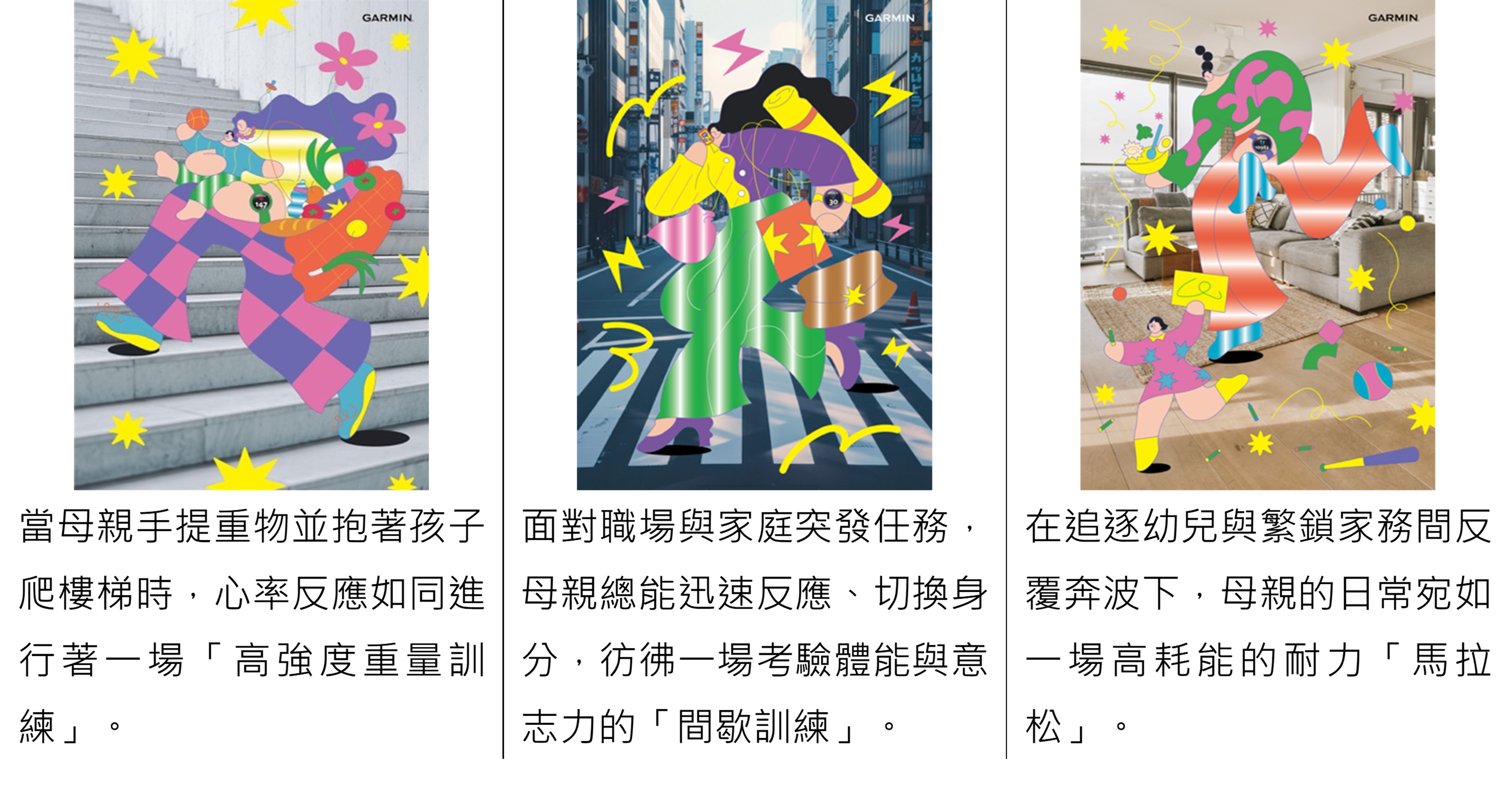 提到「耐力」,多數人會聯想到運動員。然而, Garmin 「Women of Endurance」從母職出發,重新詮釋女性在日常生活中所展現的體力與心理韌性,並指出這些長時間的身心消耗其實如同一場高強度的「隱形訓練」。透過插畫創作與穿戴式數據監測,Garmin 將抽象的疲勞轉化為可被理解的經驗,讓疲勞顯形,幫助女性理解自我身體狀態與恢復需求。